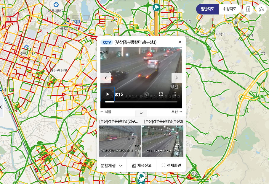 지도 색깔만으로는 실제 체감 교통량을 파악하기 어렵습니다. 이럴 때는 CCTV 영상을 확인하는 것이 가장 정확합니다.