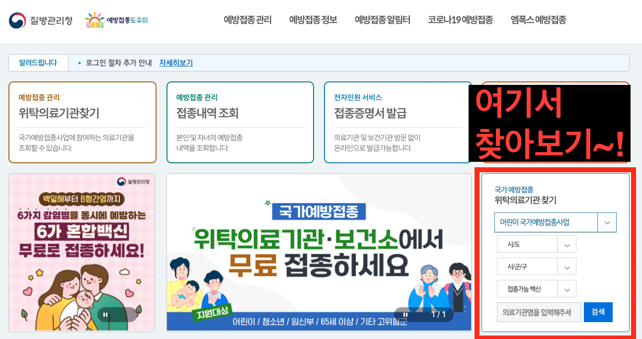 - 질병관리청 예방접종도우미 누리집(위 링크 클릭) -> 예방접종 참여 의료기관 찾기