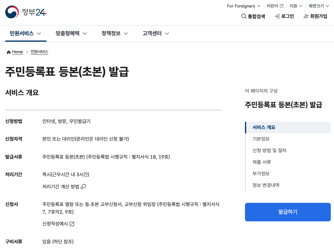 - ‘주민등록표등본(초본) 발급’ 서비스 선택