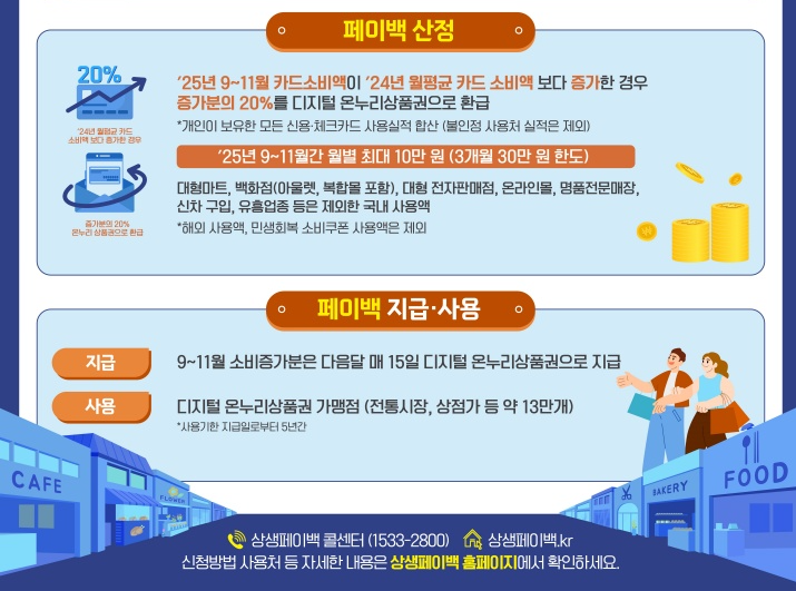| 상생페이백 | 카드 소비액 증가분의 20% 환급 (최대 30만원) | 작년 월평균 대비 증가 시 |